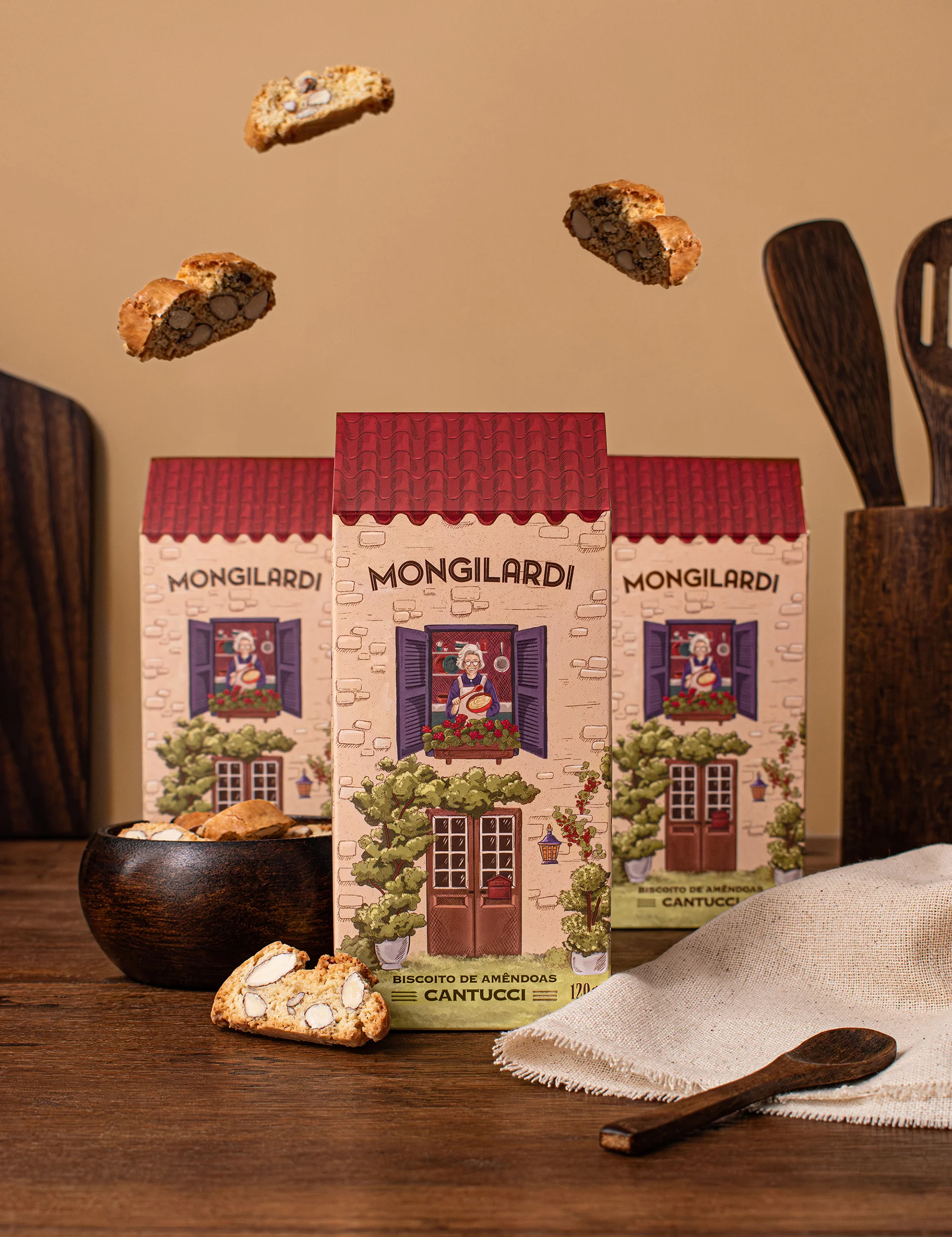 E o gato na janela? Sua presença não é mera coincidência. É uma doce homenagem ao passado da marca, quando era conhecida como Mima, o mesmo nome da gata de uma das fundadoras. Inspirados pela atmosfera da Toscana, um local que tem um significado profundo para a Mongilardi, o design em forma de casa evoca uma sensação de familiaridade, convidando os clientes a se conectarem com a história por trás de cada pedacinho dos deliciosos cantuccis.